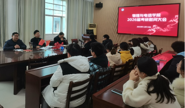 为鼓舞考研学子士气,缓解备考压力,传递学院深切关怀,2025年12月15日下午4点,物理与电信学院在物电楼205举办考研学子慰问大会。学院党委书记卢年桥,院长兰智高,党委副书记王世伟,辅导员江俊新老师、胡乐老师、徐亮亮老师与备战考研的学子欢聚一堂,在紧张冲刺阶段为考研学子送上温暖祝福与坚实支持。现场气氛温馨热烈,暖意融融。